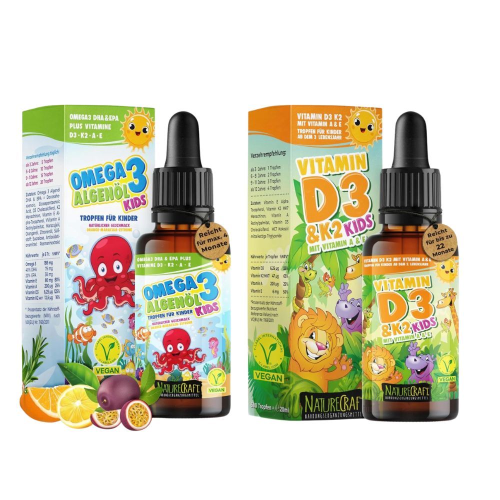 NatureCraft Kinder-Vital-Set: Vegan Omega-3 Algenöl + Vitamin D3 K2 Tropfen