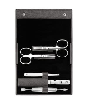 Das Set beinhaltet fünf essenzielle Instrumente für die Nagelpflege: einen Nagelknipser, eine Nagelschere, eine Nagel- und Hautzange, eine Pinzette und eine Nagelfeile. Diese sind in einem eleganten Echtleder-Etui in Anthrazit untergebracht.